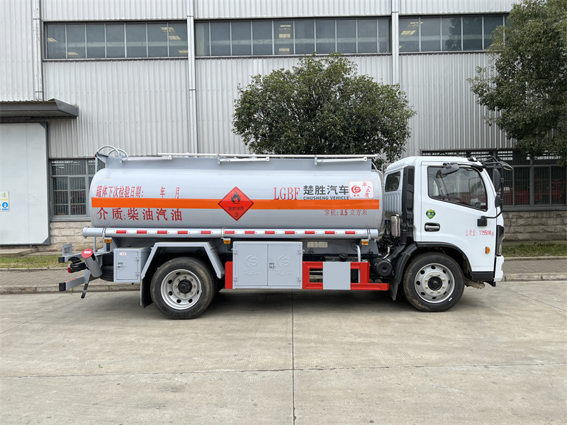 上裝配置:公告容積8.5立方,單倉帶溢流閥80-60泵,全套歐標(一個歐標罐口,一個海底閥,一個防溢流探桿及插座、一個廢氣回收、一個下裝油口)智能海底閥。大流量加油機及卷盤,升降護欄。配一個防火帽,兩根等長的輸油管及陰陽端,兩個滅火器,兩個堵頭,帶后爬梯,鋼絲網(wǎng)走道,一個工具箱,安全告示牌,其它標配。保證整車外形尺寸、罐體尺寸、外形與公告一致(3)油漆:銀粉色,貼反光條,反光帶,反光板,三個“易燃液體”字